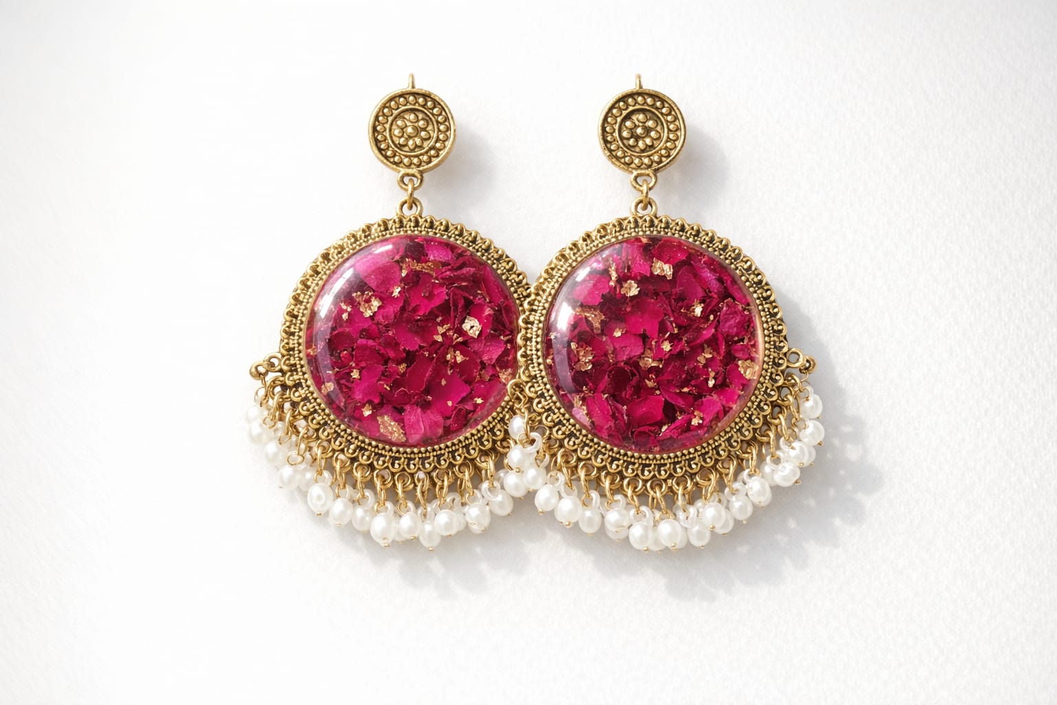 Exquisitely handcrafted resin jhumkay featuring real preserved roses encased in a crystal-clear frame. Designed for Shadi and grand celebrations, these regal earrings offer timeless elegance, making them a perfect choice for brides and special occasions.
